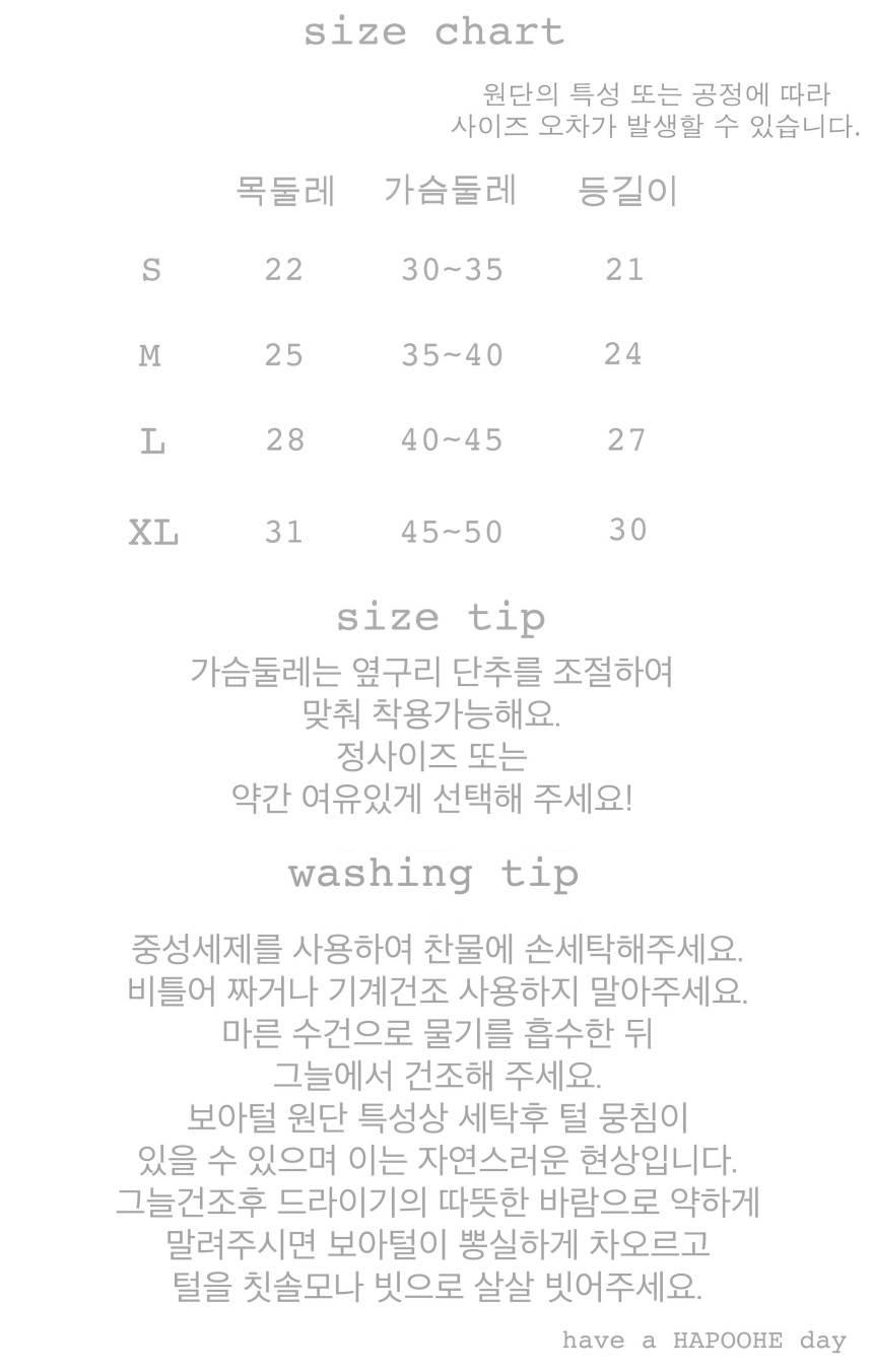 - 폭닥한 양면 보아털원단으로 따뜻하며 과하지 않아 요즘 같이 쌀쌀한 겨울은 물론 3월까지 부담없이 착용 가능해요!