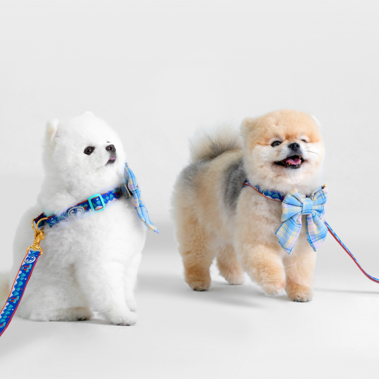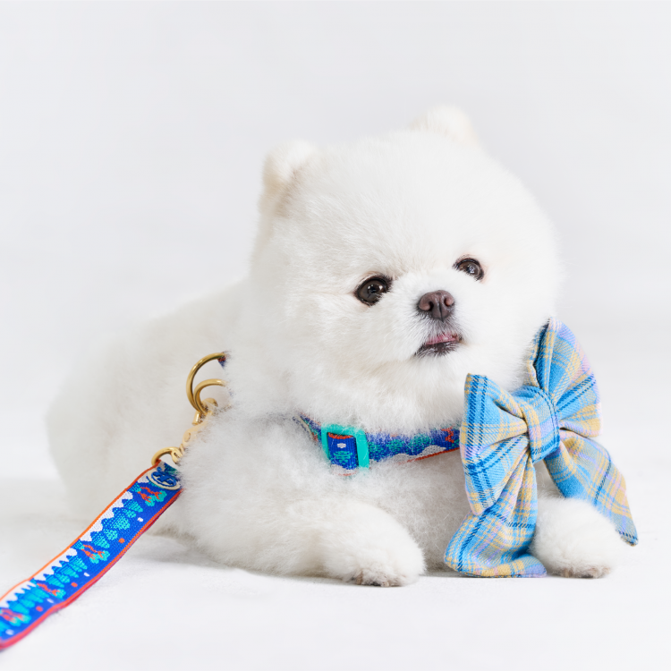 부드러운 크림 색상과 하늘색 조화의 사랑스러운 반려견 리본