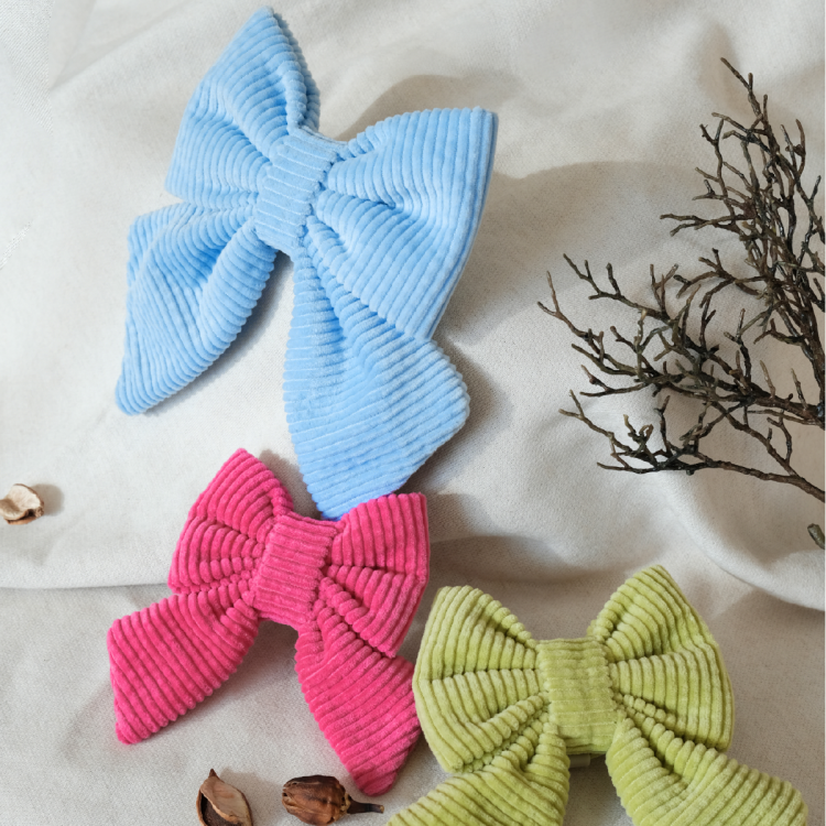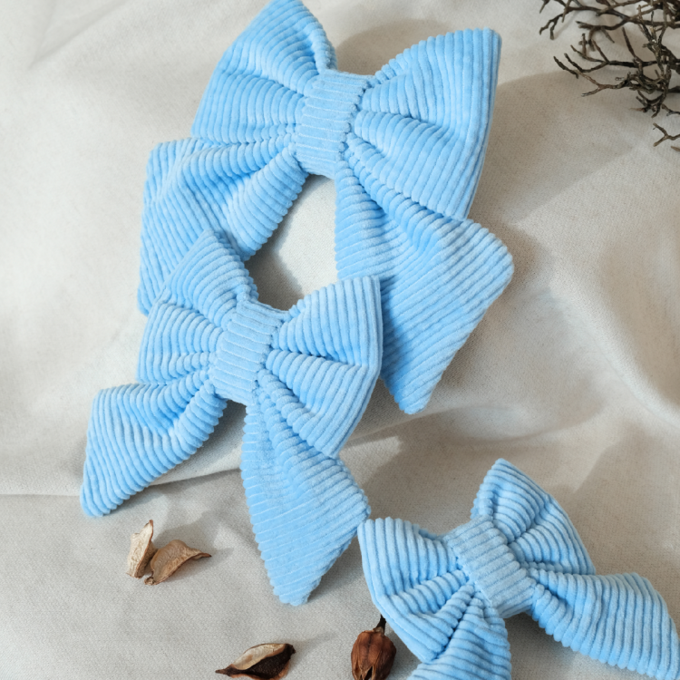 겨울의 따스함을 담은 하늘빛 코듀로이 강아지 리본